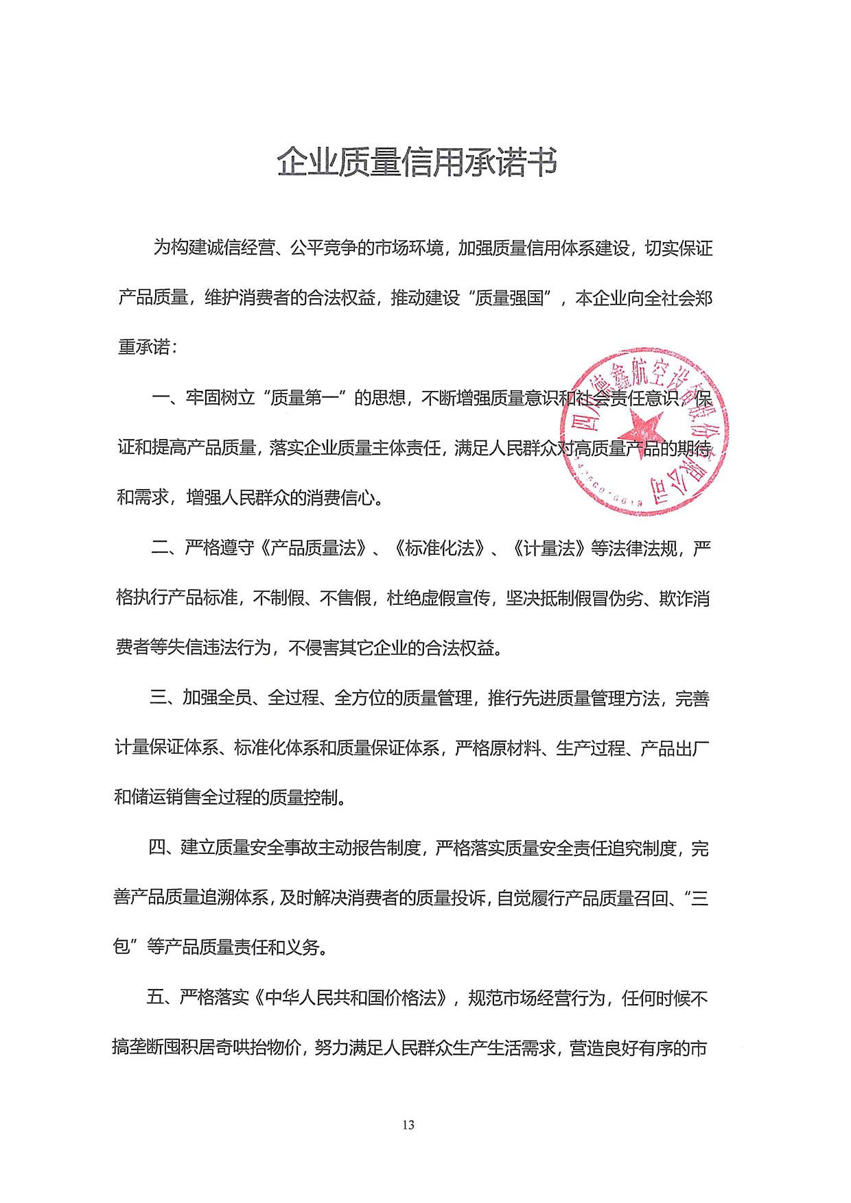 为构建诚信经营、公平竞争的市场环境,加强质量信用体系建设,切实保证产品质量,维护消费者的合法权益,推动建设“质量强国”,本企业向全社会郑重承诺: