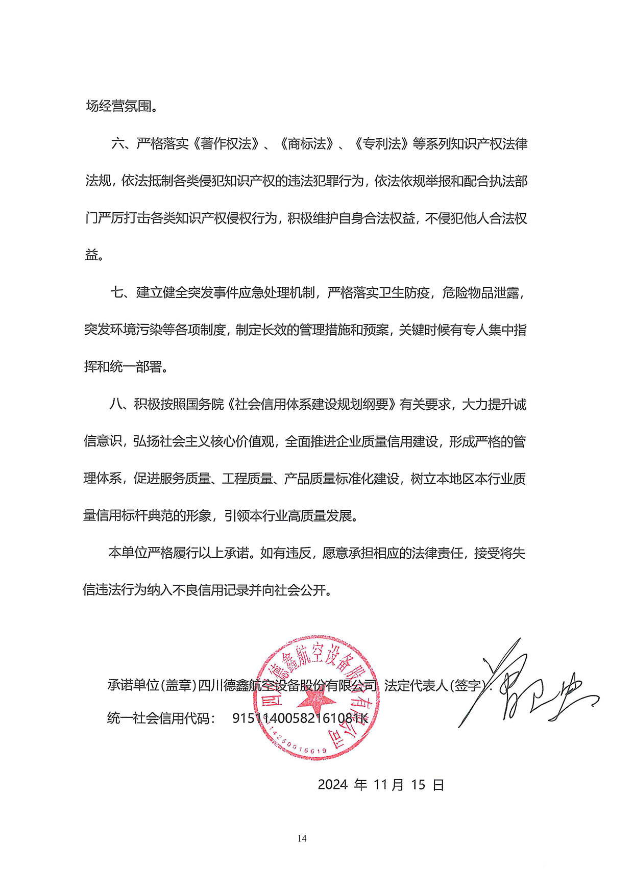 八、积极按照国务院《社会信用体系建设规划纲要》有关要求,大力提升诚信意识,弘扬社会主义核心价值观,全面推进企业质量信用建设,形成严格的管理体系,促进服务质量、工程质量、产品质量标准化建设,树立本地区本行业质量信用标杆典范的形象,引领本行业高质量发展