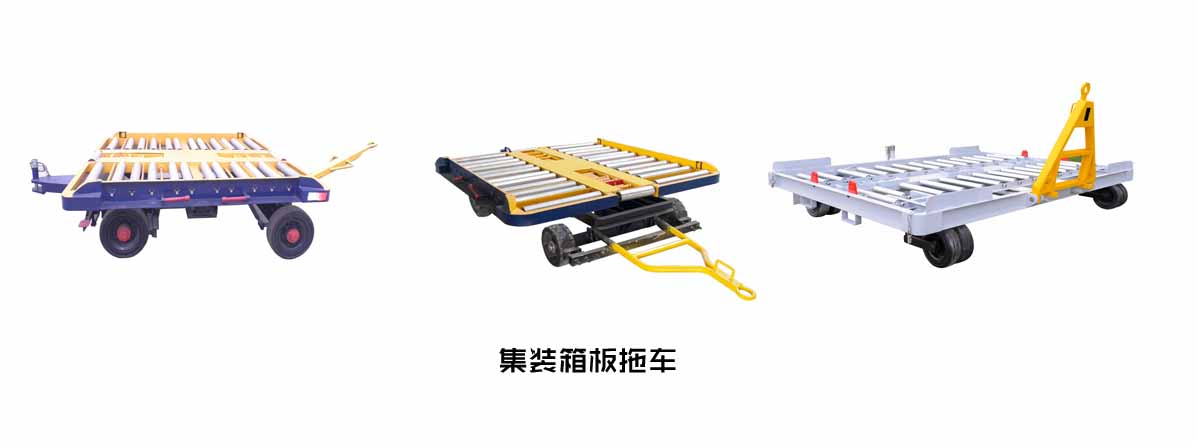 该类产品根据适用的集装箱板尺寸,装有活动式制动限位装置,两侧装有固定限位装置,使集装箱板在装运过程中不发生跳动和脱轨通过多车组合,可用于机场大批量货物的运输和短途转运。