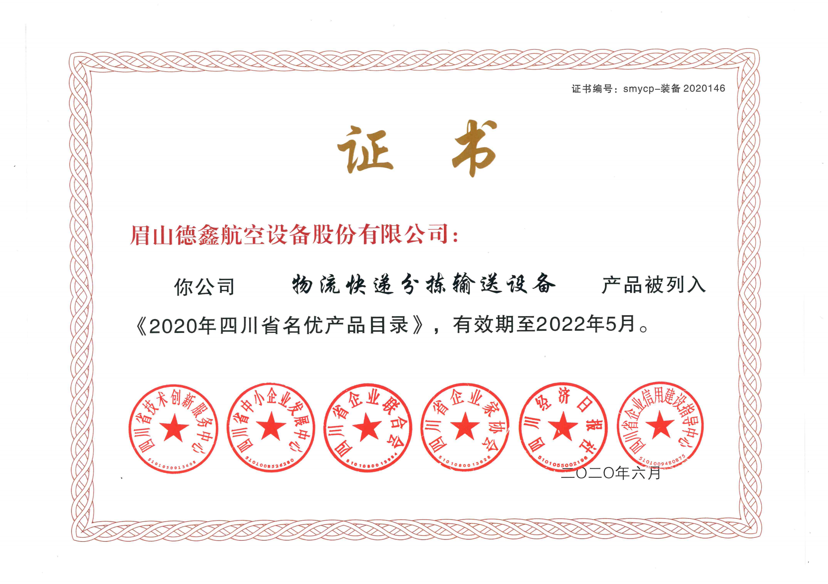 公司“物流快递分拣输送设备”产品被列入了《2020年四川省名优产品目录》(证书编号:SMYCP-装备 2020146)