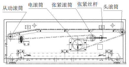 (2)皮带:黑色方格带,具有阻燃、防霉、防静电、无毒性、不易老化、抗变形等特性,皮带厚δ7mm,热硫化工艺无端头。在使用过程中应防止油类、酸碱类液体对皮带的腐蚀。调整方面主要为“跑偏”调节及张紧调节。皮带正常工作时,其张紧度应是适宜的。皮带张紧太松,则皮带与主动滚筒之间容易打滑,皮带速度及传递的动力都会打折,影响行李输送;皮带张紧太紧,则会加大电滚筒的负荷,加速皮带的磨损,也会加速其它传动件的磨损。皮带张紧依靠电滚筒附近两侧的张紧滚筒(φ60mm)及张紧螺杆,该张紧滚筒两侧用张紧螺杆独立进行调整,通过张紧滚筒进行张紧。若皮带“跑偏”,也主要通过该张紧螺杆进行调节。如下图: